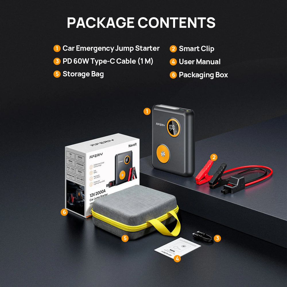 Arrancador de batería para coche AFERIY GK03 ×1、Pinzas inteligentes ×1、Cable PD 60W Tipo-C (1 m) ×1、Manual de uso ×1、Bolsa de almacenamiento ×1、Caja de embalaje ×1