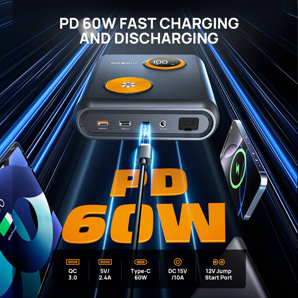 El arrancador de batería AFERIY cuenta con una batería de alta capacidad de 27500 mAh, que garantiza tanto el arranque de emergencia del vehículo como la función de banco de energía para cargar tu teléfono, tablet o computadora portátil.